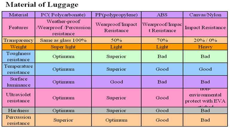 It has become a global trend that all material of luggage has been replaced by PC, which is of same quality compared with Samonite, Rimowa, Crown and Diplomat, etc.